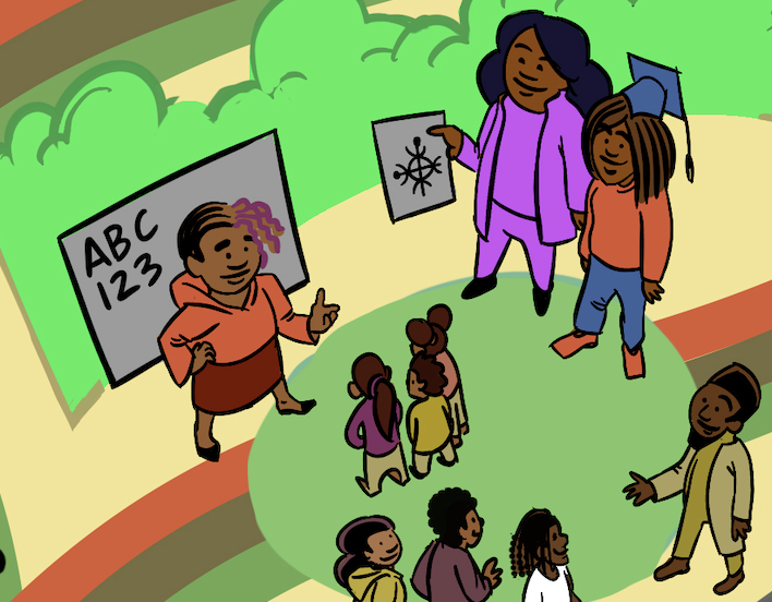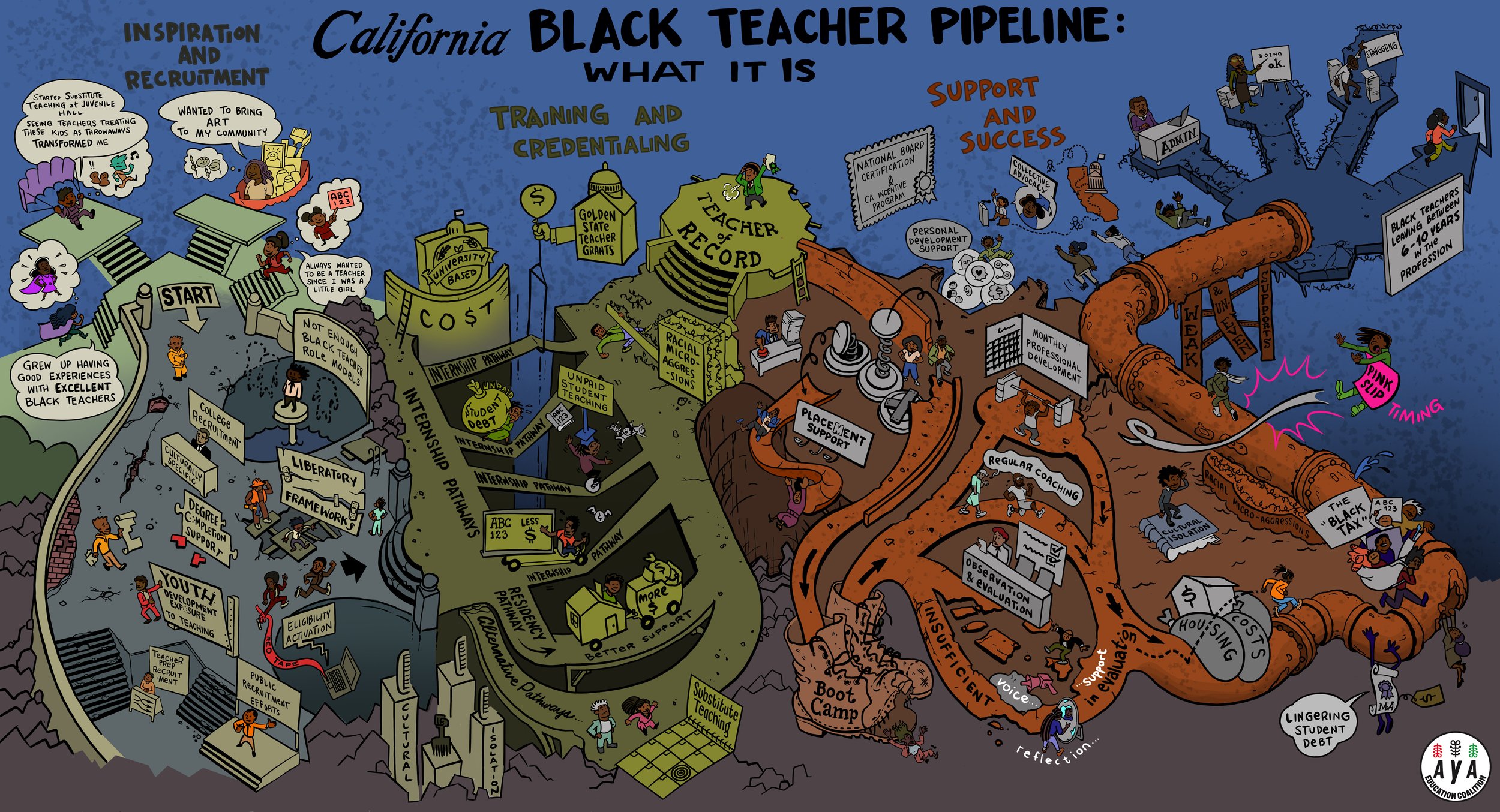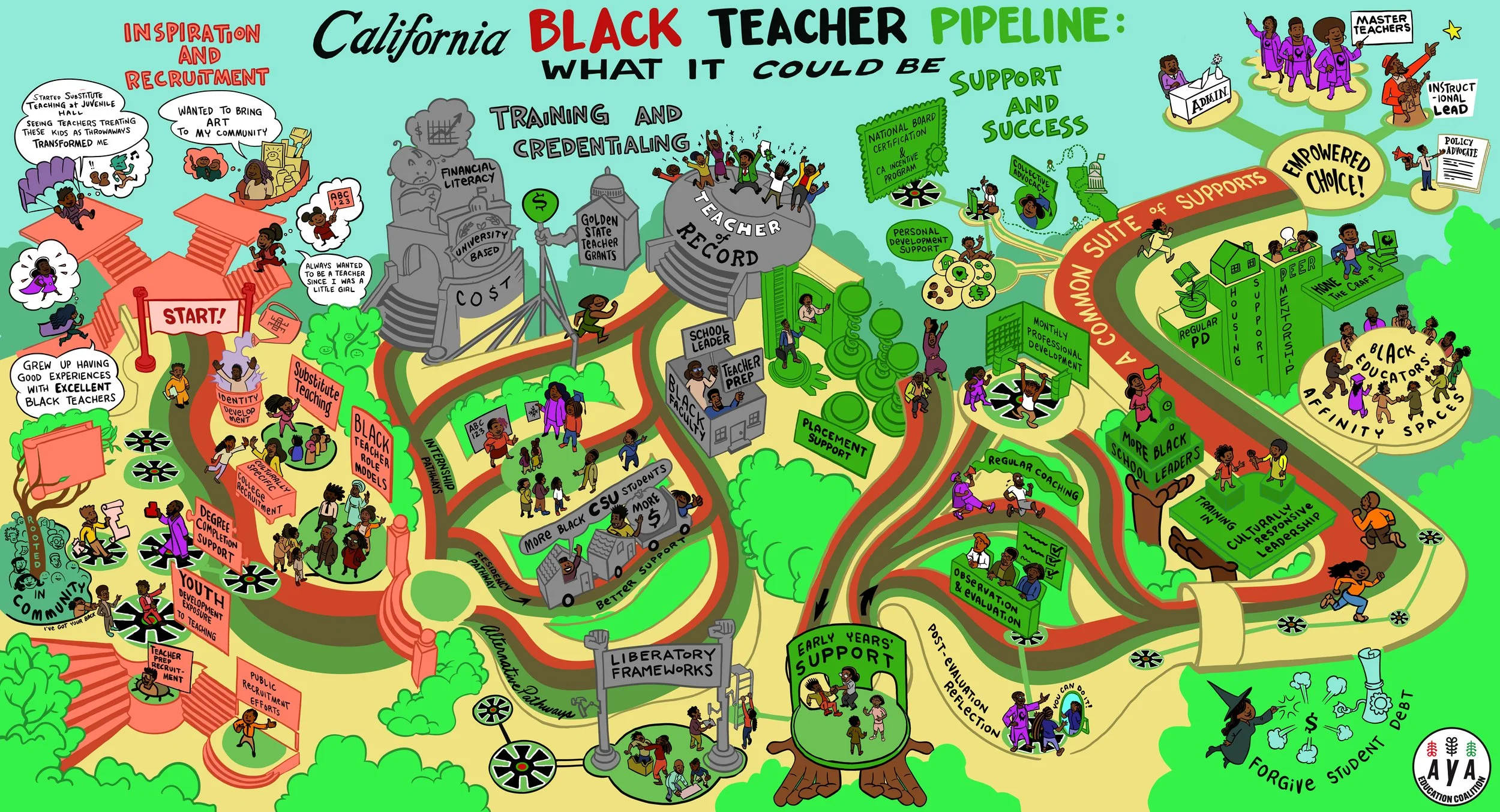 To explore the underlying dynamics leading to California’s failure to bolster the number of Black educators, The Aya Education Coalition (AEC) developed the ‘What It Is’ visual roadmap. To move past admiring the problem, AEC envisioned ‘What It Could Be’ if a full suite of opportunities and supports were provided current and potential Black educators. In collaboration with visual artist Alan Quiros, UC Berkeley researcher Brenda Gonzalez Guerrero, and Black educators across California, The Aya Education Coalition is proud to present this pair of California Black Teacher Pipeline Roadmaps.